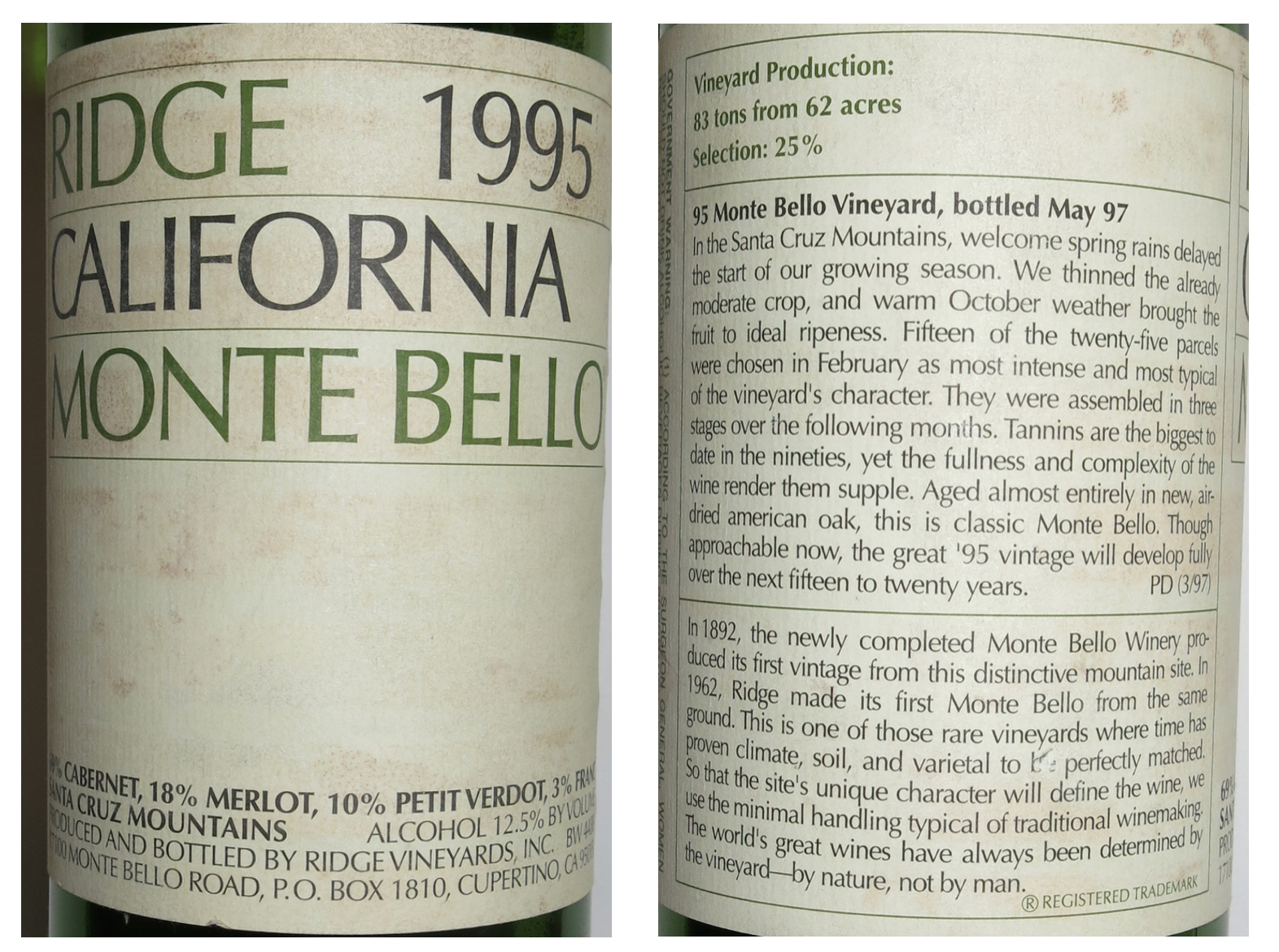 When the slow smoked steak was ready, my husband opened up this 1995 Ridge Montebello. It is now 20 years old and the label on the Montebello says that now will be the appropriate time to drink this wine.