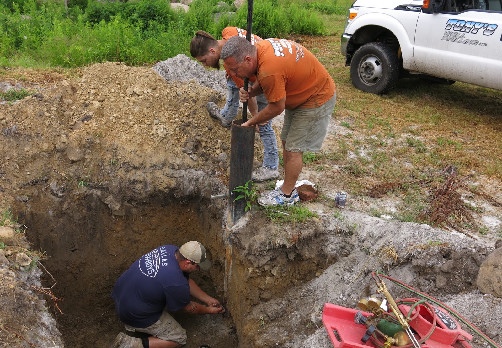 But, we have been waiting for the well crew to show up to put in the well pump. Today (really yesterday, June 29th), they came with the pitless adapter. I learned that there are many steps in making a well that has the potential to deliver 40 gallons a minute, functional. Today the crew installed the brass pitless adaptor. My husband kindly explained to me what a pitless adapter is. I find it to be very ingenious. But, first, you need to attach the pitless adapter to the sidewall of the existing iron pipe by cutting a hole with an acetylene torch. Then the parts that attach to the inside of the well pipe and the outside of the well pipe must be maneuvered in place. (Please see the annotated illustration provided above.)